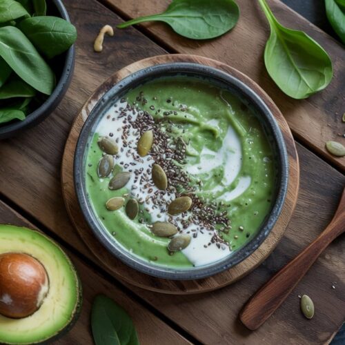 This bowl balances healthy fats and leafy greens for sustained energy. It blends to a thick, spoonable texture that pairs well with crunchy toppings.
