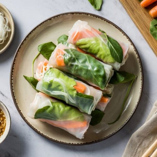 These fresh rolls are quick to make and feel light while still filling. Bright, crunchy vegetables paired with a savory-sweet peanut dipping sauce make them great for lunch, weeknight dinners, parties, or meal prep.