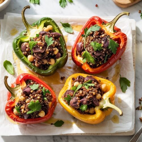 Warm, savory, and filling, these stuffed peppers combine tender lentils and sautéed mushrooms for a plant-forward main that feels hearty without heaviness. The filling has rich umami from mushrooms and a bright tomato note, making it great for weeknight dinners or a make-ahead meal for guests.