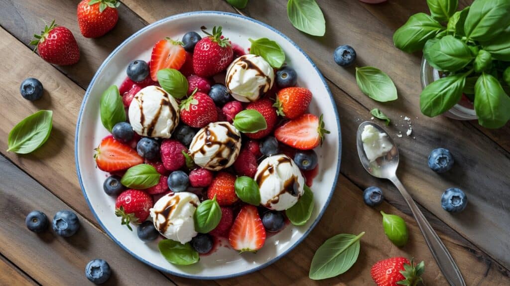 - Texture – Smooth cheese contrasts with juicy berries and tender basil leaves.