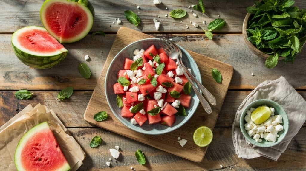 - Texture – Juicy watermelon contrasts nicely with creamy feta and crisp mint leaves.