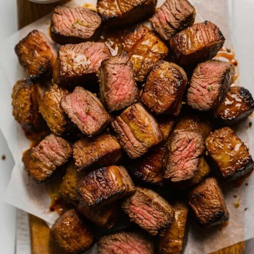 For Steak Bites, go with Garlic Butter Mushrooms, Parmesan Truffle Fries, Caesar Salad, Creamed Spinach, and Roasted Garlic Mashed Potatoes.